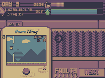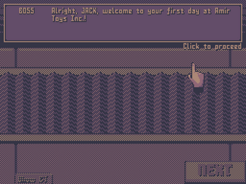 After months of failing to find any jobs due to the incident, Jack gets hired by Amir Toys Inc. His job is simple: connecting parts together to make pieces for toys. But after repeating the same process over and over without any breaks, his ENERGY drains quickly... Luckily, he can replenish his energy by playing his GameThing™ on the job, just so long as his boss doesn't find out!
